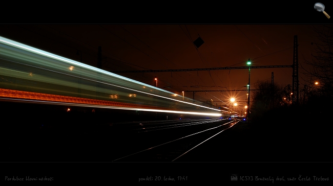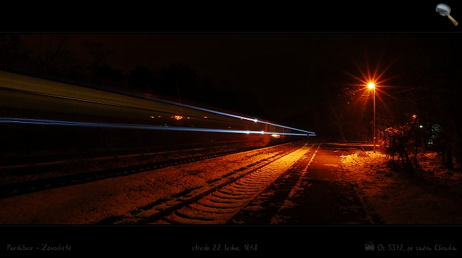 Malá série nočních (dlouhoexpozičních) fotografií, na kterých jsou zachyceny železniční soupravy, opouštějící pardubická nádraží do všech směrů, tedy na Prahu, na Českou Třebovou, na Hradec Králové a na Chrudim.