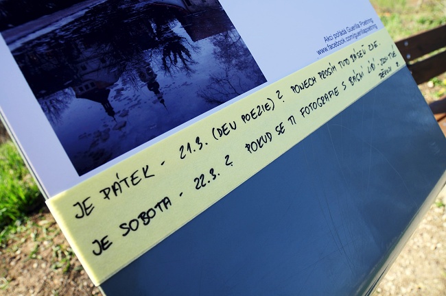 Už je to tu - pátý ročník Básnění v ulicích - projekt Guerilla Poetring. Tři fotografie s básní (autor fotografií jsem já, autor básní jsem ve dvou případech též já, v jednom případě Vašek Koubek) jsem umístil v našem městě: